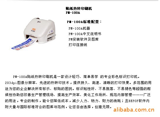 日本MAX 彩色标签打印机PM-100A 热转印贴纸割字印刷机 原装正品 一年质保 终生维护 PM-100A贴纸热转印刷机是一款设计轻巧、简单易学 的专业彩色标识打印机。203dpi图像分辨率、先进的热转印技术,提供持久、高速、清晰的打印效果。多范围的用途为您的企业解决所有标示、标贴的困扰。标识粘性好、不易脱落、不易褪色等超强的耐候性协助您改善生... {产品特点}: {使用范围}: {基本参数}: 最大输出范围: 100*2000MM 分割输出面积: 190*2000MM 重 量:6kg 消耗电力: 最大44W 待机时6W 应用案例: 广州穗城电子科技有限公司是一家从事工业标识打印系统销售与售后服务的专业化销售服务商。本公司主要销售佳能/MAX/硕方/力码/标映线号机、兄弟/MAX/贝迪/锦宫/力码/卡西欧/DYMO/精工/威码标签机、东芝/斑马/Datamax/博思得/立象/科诚/西铁城/TSC/艾利条码打印机、佳能/硕方标牌机、DATACARD/ZEBRA/FARGO/EVOLIS/MAGICARD证卡打印机、Symbol条码扫描器、爱普生/虹光/明基/紫光扫描仪、线号机/标签机/标牌机色带、套管等相关耗材、尼龙扎带、接线端子、金具系列、宝工工具、德图/福禄克/共立仪器仪表类。公司销售的产品品牌主要包括硕方SUPVAN、佳能NTC、兄弟BROTHER、贝迪BRADY、美克思MAX、东芝TOSHIBA、Datamax、博思得POSTEK、斑马ZEBRA、锦宫KINGJIM、标映BIOVIN、力码L-MARK、卡西欧CASIO、科诚GODEX、西铁城CITIZEN、宝工、共立、德图等品牌。在国内电力、电气、通信、铁路、开关、石油化工、建筑、安装、电梯、办公成套设备、电控、配电设备线路标识、办公领域、工厂、仓库物流、电信行业、宾馆饭店、员工胸牌、医疗、学校、图书馆等多个行业及领域都拥有广泛客户群和良好的声誉。 如果您对我们代理的产品感兴趣,我们可以根据您的需要提供以下服务: l 技术咨询:我们将随时恭候您的来电,并向您详细的介绍产品的特点和性能,解答您的疑问; l 更详细的技术资料:根据您的要求,提供有关产品详细的功能特点和技术资料; l 人性化沟通:对于广州及其附近地区的客户,我们可以携机送货上门,并为您现场演示、讲解实际应用,便您对产品的性能特点及注意事项得到100%的了解; l 最快速供货:充足的货源保障,快捷的商务流程,正常情况下当天订单当天处理完; l 周到、可靠的售后服务:设有常用设备维修备件库,可直接提供保修和耗材供应,使您对购买的产品绝无后顾之忧;24小时售后服务热线:13560370022。
