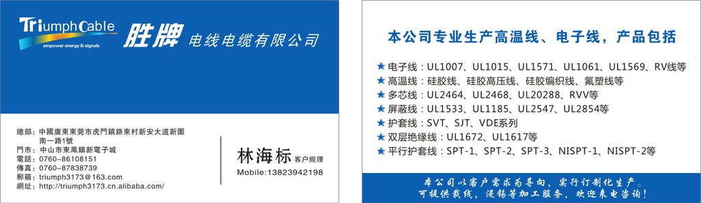 品牌故事:胜牌持有人东莞胜牌电线电缆有限公司,前身为承兴电线电缆厂,建厂于2002年,迄今已10余年,客户遍及国内外。特点:按国标或客户要求定制电缆。诚信为本,科学报价,拒绝暴利。交易灵活,量小量大都可以做,交货期短,产能充足,认证齐全。