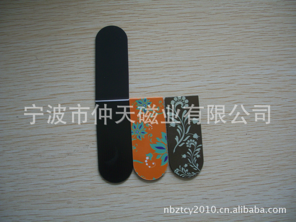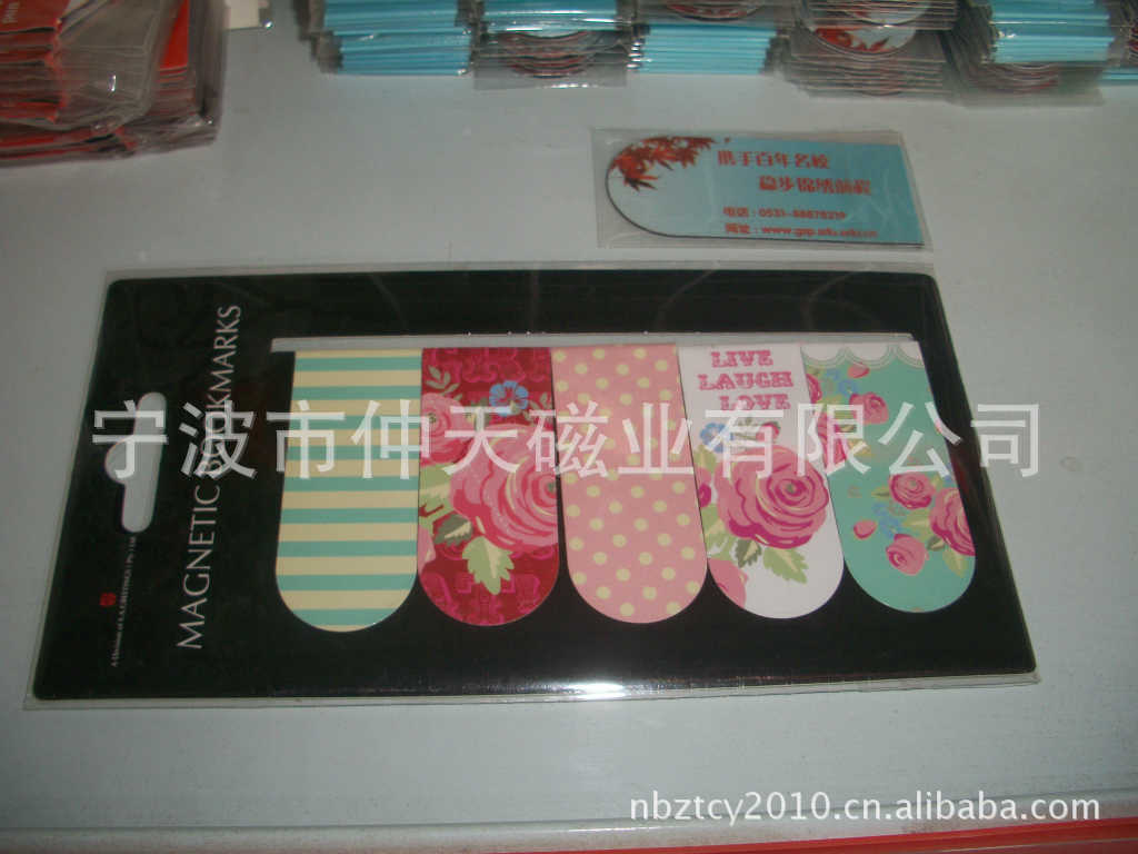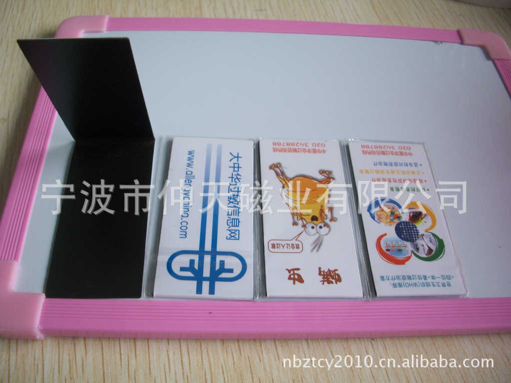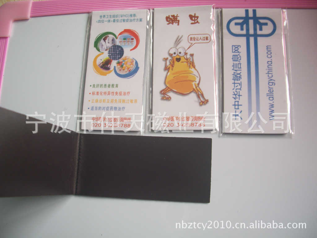 2)磁性书签:采用下面软胶磁铁(对吸磁)+上面铜版纸铜版纸或PVC四色印刷腹膜对折制作而成。