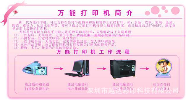 我司生产的新款玻璃彩印机 深圳玻璃彩印机 玻璃彩印机厂家,可在任何材质上印制各种图案。如:木、竹、石、玻璃、皮革、金属、水晶、标牌、贝壳、布艺……等各种材质上,直接打印成像,立等可取.范围涉及到个人用品、工艺礼品、办公用品、文具标牌、家装建材、鲜花布艺、玩具礼品……等几十类市场。直接把照片打印在玻璃上的机器采用非接触式的印刷技术,任何多色图案一次印制成功,工序简单,无需制版,套色和复杂的晒板程序,不会对材质造成损坏,是手工绘画、丝网印刷技术的一次技术创新,直接把照片打印在玻璃上的机器印制的图案色彩艳丽,具有防水、防晒、耐磨损、永不退色等优点。手机:13302960847/18025362361 |