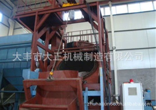 工作原理: 将工件放入滚筒带滚筒中,操作人员按下“运行”按钮,抛丸室门气动关闭,抛丸清理开始,滚筒向前运行,工件不断地进行翻滚,高效强力抛丸器将抛丸高速抛射到正在翻滚的工件表面上,工件可完全均匀地得到清理。钢丸通过滚筒上的溜孔流入螺旋输送机,再将钢丸输送到斗式提升机,经斗式提升机提升到分离器,被分离后存储待用。抛丸结束后,抛丸室门自动开启,滚筒