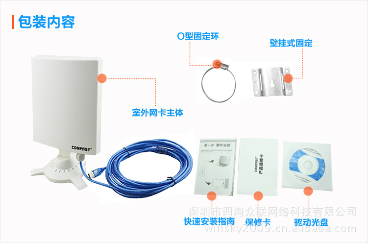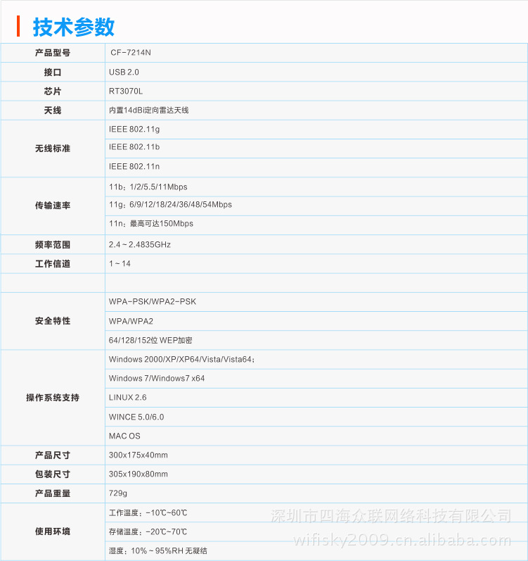 品牌 : COMFAST型号 : CF-7214N操作系统 : WindowsXP,2000,Vista,7类型 : 局域网卡接口 : USB2.0、Mini USB速度 : 150M连接方式 : 无线网卡尺寸 : 300×175×40(mm)技术规格 : 符合 IEEE802.11b/g/n标准加密方式 : 64/128-bit WEP Encryption,WPA, WPA-PSK, WPA2, WPA2-PSK,TKIP/AES特性 : 2.4G室内、外防水工程终端机(天线5000mm)包装清单 : 终端机×1;天线×1;说明书×1;保修卡×1;驱动光盘×1
