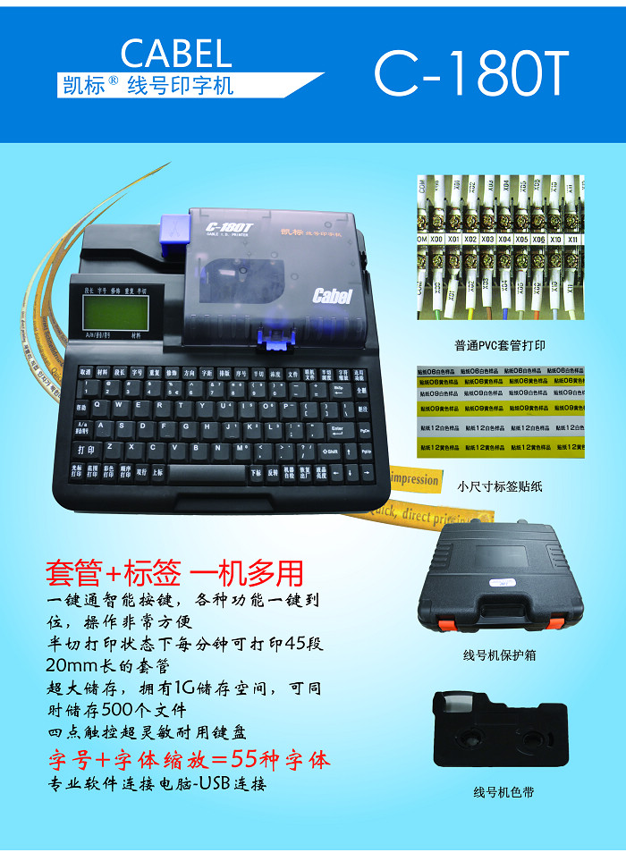 C-180T线号机|打号机在打印材料方面,将打印材料的尺寸扩大,通常情况下线号机解决的都是6平方以下的套管,特殊情况可以利用C-180T打印更宽的PVC套管或者热缩套管。在速度方面,线号机C-180T分两档速度,实现高速和低速打印;同时,增加USB接口并提供相应软件实现连电脑打印。在存储量方面,线号机|打号机C-180T拥有1G内存,可存储500个文件,每个文件1000个字符。