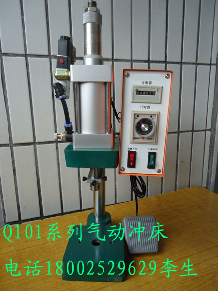 Q101系列气动型台式精密冲压机,属小型精密压力设备。本机生产效率高,操作方便、噪音小,精度高。被加工的零件尺寸准确、冲切表面光洁。适合电子、仪器、仪表、照相机、首饰、小五金及服装、鞋帽业;可对薄板、条料、卷材进行剪切、冲孔、落料、成型、弯曲、铆合等工序;适用有色金属,塑料件烫模等精刻模具加工。