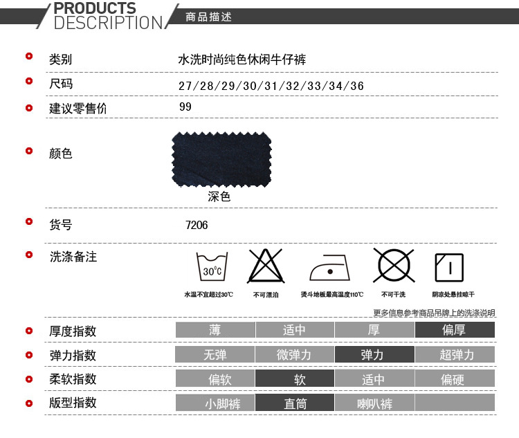 本公司主要生产:女士牛仔裤,男士牛仔裤,牛仔短裤,牛仔中裤并结合欧美,韩版等各种风格的牛仔系列服饰。产品远销全球以及全国各地批发市场,国外以非洲,东南亚,如马来西亚,菲律宾,缅甸,泰国居多。质量和服务都得到了广大客户朋友的认可。产品做工精致,精选纯棉高弹性牛仔洗水布,亲肤舒适,透气好,弹性佳,不易变形,不褪色,修身廓形,经典版型,简约时尚,可以随心搭配服饰,衬托出你干净整洁的精神面貌和窈窕的身材。我们也可以按照您的样板打板定做。