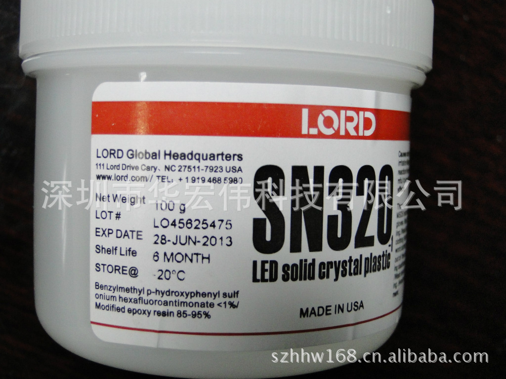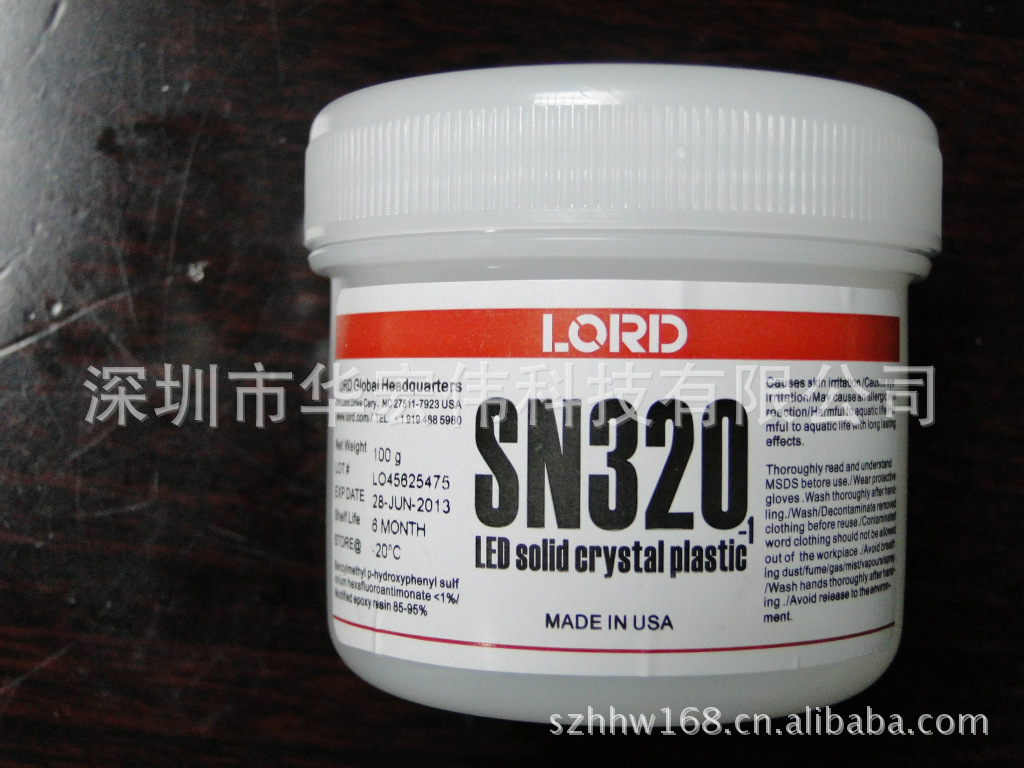 美國洛德公司之產品 SN320-1 是晶片粘合劑,適用于 LED 制程,是一種單組份材料,不擴散,無氣泡,高 溫下接著強度好,抗UV、黃變性能強,為 LED 晶片導熱、提高光通量有顯著效果;特別為 LED SMD、 LAMP、TOP 高速分配和要求既良好又精確的快速點膠的晶片組裝而開發的;使用時有一定的節奏、壓力、 準確的排量或帶有線形排放頭。