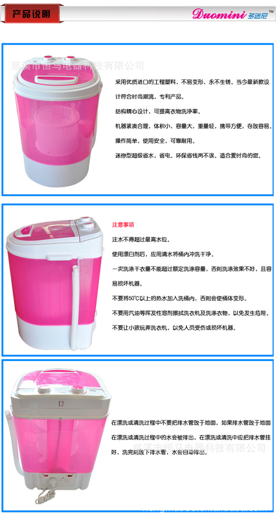 公司投巨资研发炫彩时尚迷你洗衣机系列.恒马电器---中国迷你洗衣机制造专家;多迷尼洗衣机,中国第一迷你洗衣机时尚品牌。恒马电器竭诚欢迎全国各经销商,代理商,OEM合作商前来洽谈合作,共赢未来!