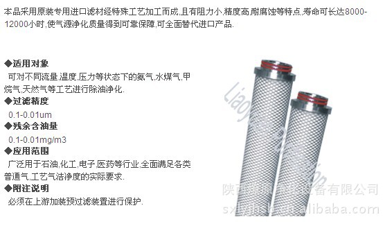 本品采用原装专用进口滤材经特殊工艺加工而成,具有阻力小、精度高、耐腐蚀等特点,寿命可长达8000-12000小时。使气源净化质量得到可靠保证,可全面替代进口产品。