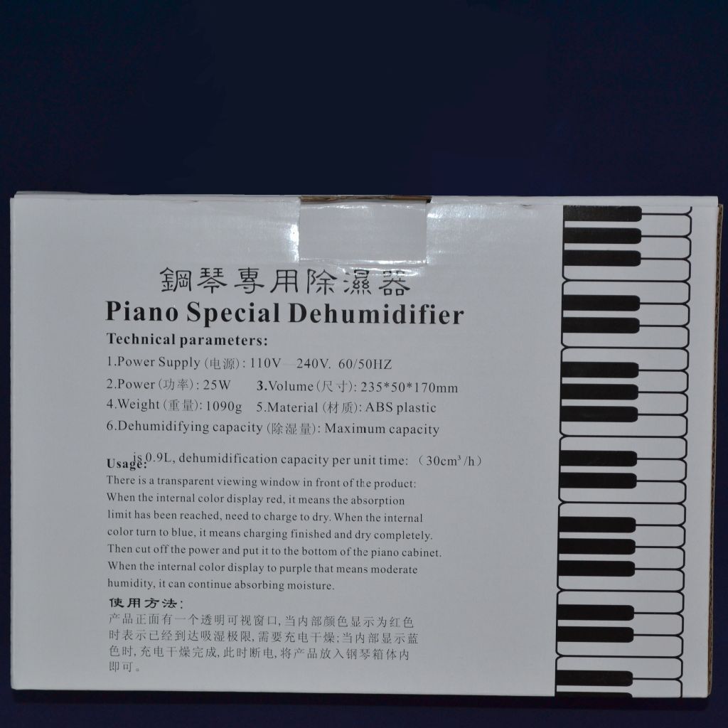产品正面有一个透明可视窗口,当内部显示蓝色时,充电干燥完成,此时断电,将产品放入钢琴箱体内,当内部显示紫色时,表示湿度适中,可以继续吸湿工作。
