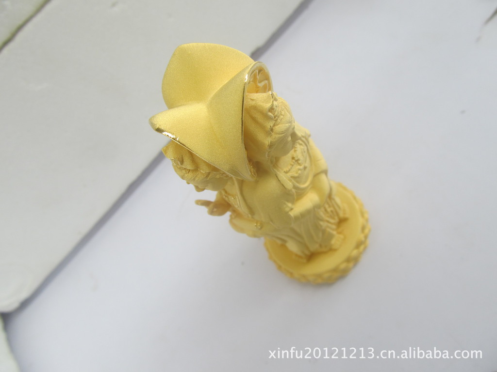 【产品材质】:绒沙金工艺礼品,以99.9%金、银、铜等贵重金属以及高分子混合材料为原料,采用高科技技术和先进的铸金工艺,通过多道工序精细制作而成。其表面为千足纯金,经国家权威检测机构检测合格。配有广东省珠宝鉴定协会鉴定证书。此产品其外观与各大金店的纯金摆件一模一样,不仅具有黄金的保值性,更具有艺术鉴赏、收藏价值。