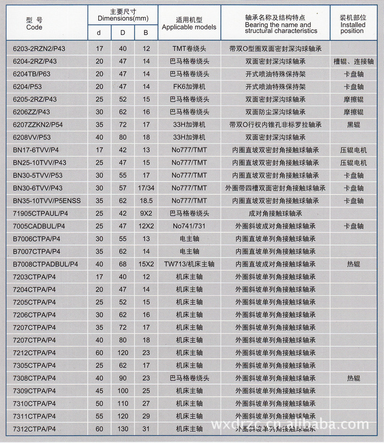 通用7200系列,7300系列角接触球轴承, 7000,71800,71900系列机床主轴轴承, H7000,H71800,H71900系列高速机床主轴轴承, HC7000,HC71800,HC71900系列超高速角接触球轴承, DZ系列电主轴角接触球轴承。