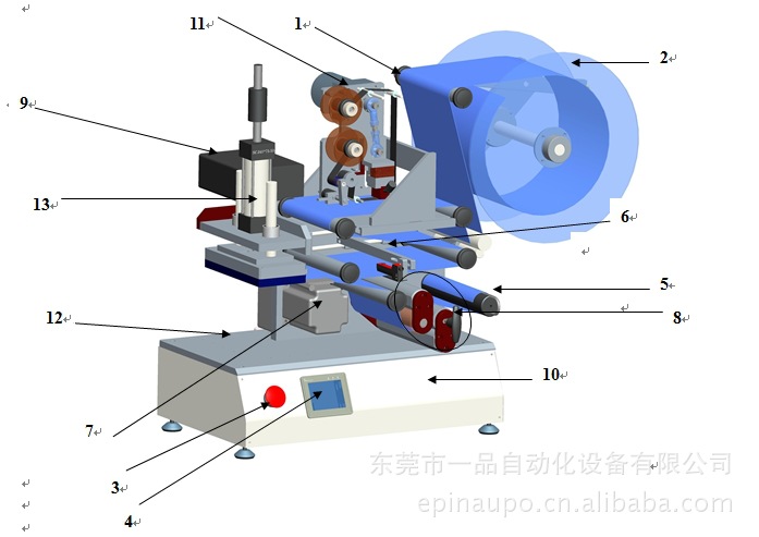 *核心工作原理:传感器检测到产品到位或脚踩发出产品到位信号,吸着标签的吸头下降贴标并覆标,然后退回原位吸附下一张标签,等待下一个贴标信号,一张标签的贴附动作完成。