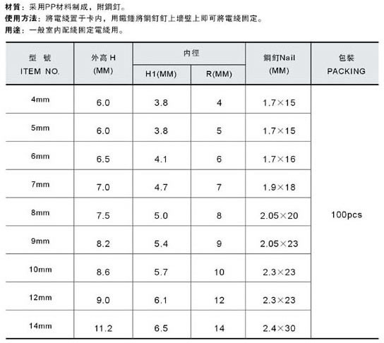 ●用途:一般室内配线固定电线用,大一些的线卡有些用于固定电缆管,水管等。