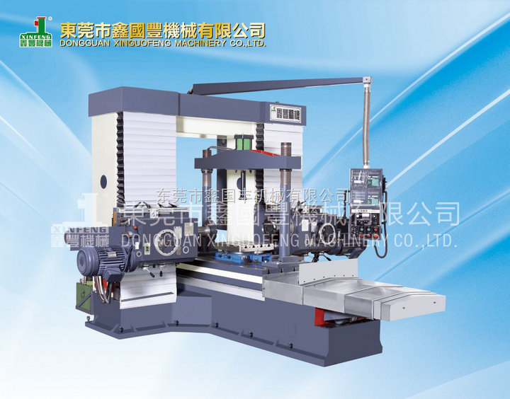 工作形式:工作台沿着床身导轨做前后运行为X轴;镗铣头沿着横梁导轨做左右运动为Y轴;镗铣头沿着拖板导轨做上下运动为Z轴;横梁沿着左右立柱做上下为U轴。也可按需要在左右立柱上分别或单独安装镗铣头,增加轴数,扩大加工功能。