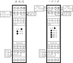 注:订货时必须注明量程范围 (范围内可任意选择)。订货指南:用户需要热电阻Pt100型温度变送器温度范围0~200℃,订货型号:WP6214(Pt100 0~200℃)