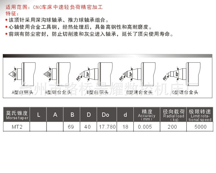 超精度数控回转顶尖MT3采用深沟球轴承,推力球轴承组合。心轴使用合金工具钢,经热处理后,具备高钢性和高耐磨度。本款产品前端有防尘密封,防止切削液和灰尘进入轴承,延长了顶尖使用寿命。