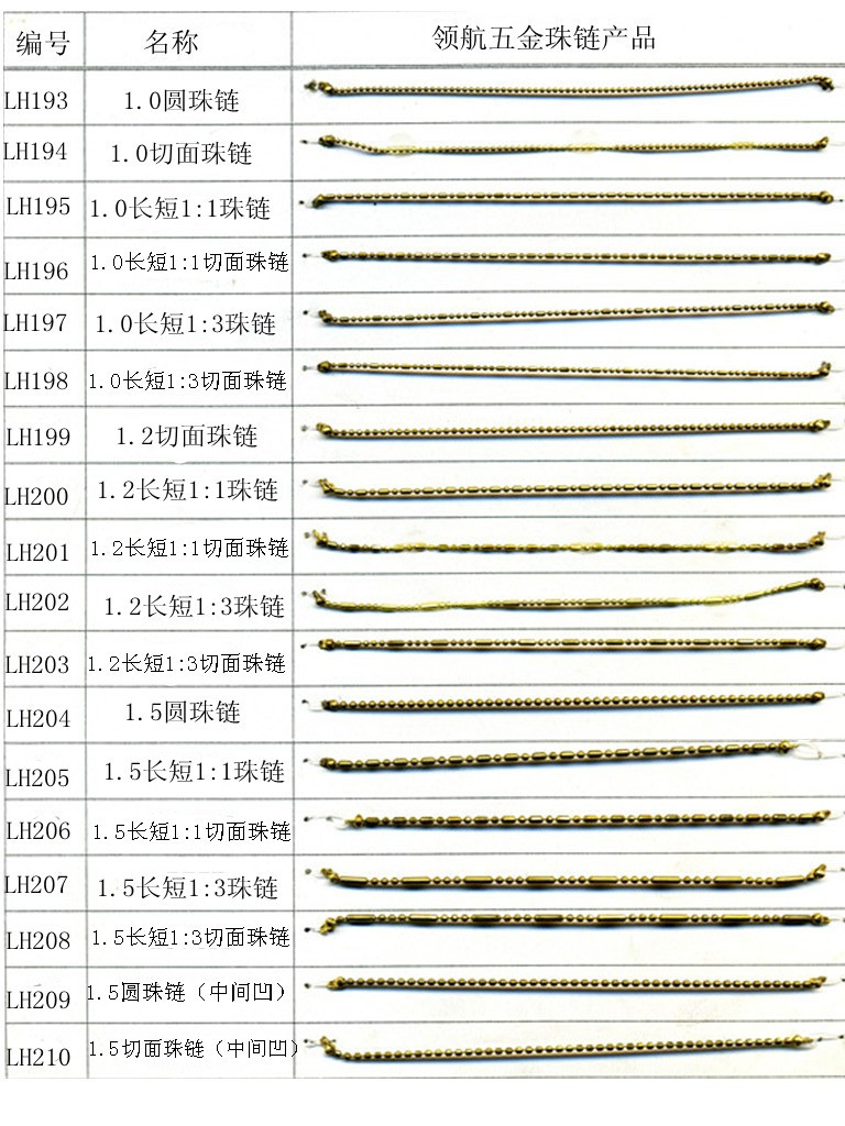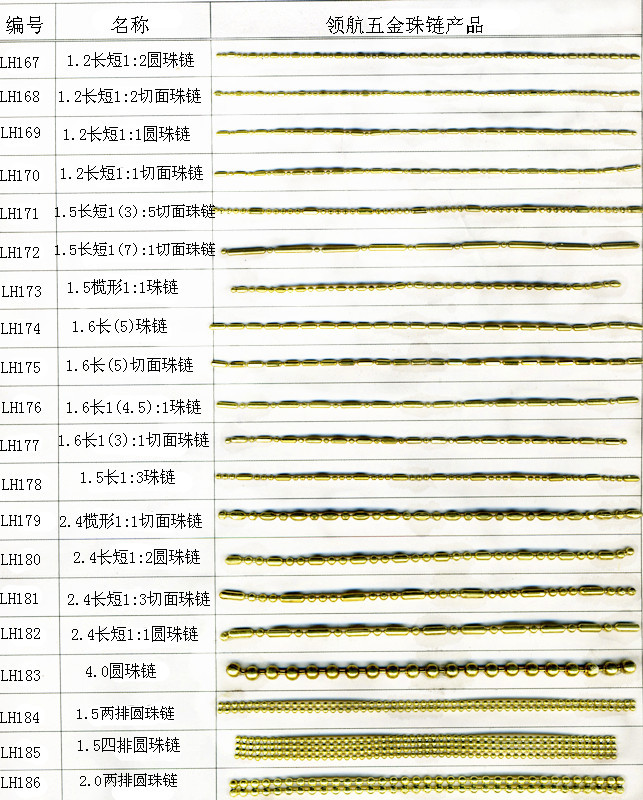 东莞市领航五金制品厂主要生产产品:五金饰品铝铜不锈钢网片、首饰链、珠链、珠链单珠.蛇链、圆蛇链、扁蛇链、O字链、侧身链、磨链、子母链、五金饰品链条、麻花链、玉米链、圆网链、扁网链、狐尾链、珍珠链、BL链、五金饰品韩国链.手袋箱包饰品链、礼品吊链、服饰链、玩具吊链、灯饰链、手链、手扣链、项链、匙圈、开口圈、珠链配件头珠腰扣、珠骨扣、花篮扣、耳仔扣(豆仔扣)、朱胆扣、D扣、三角扣、龙虾扣、五金配件狗扣、圈类、扣类等五金饰品配件、首饰配件、服饰配件、手袋箱包配件、鞋饰配件及珠链机模具,也可根据客户要求或来样品设计生产。
