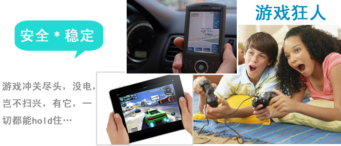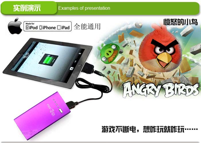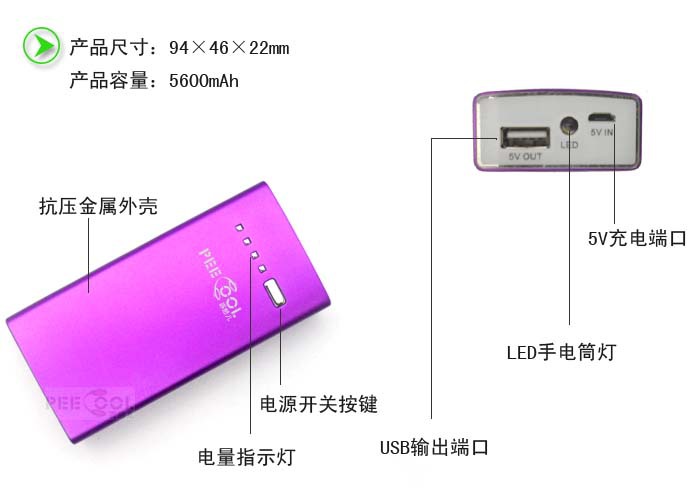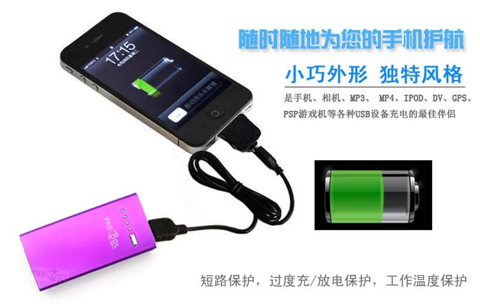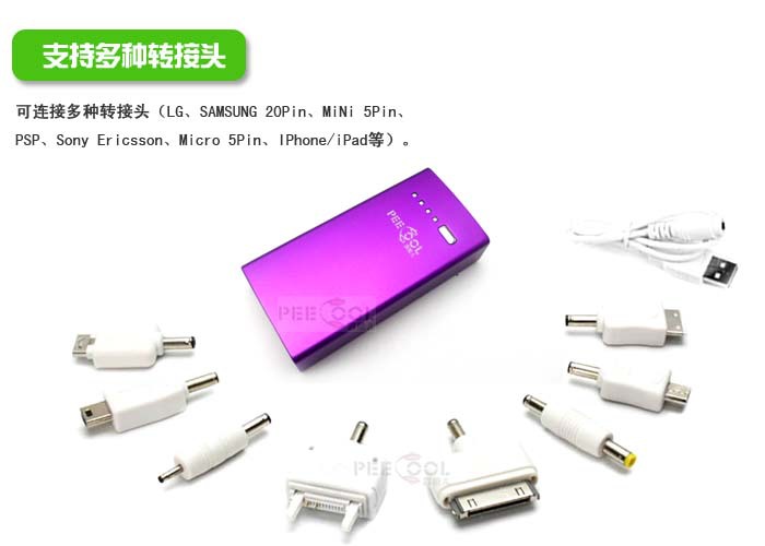 3、电源输出接口:配备多种接口配件,通过A母USB接口输出至其它5VDC输入的通讯数码产品;