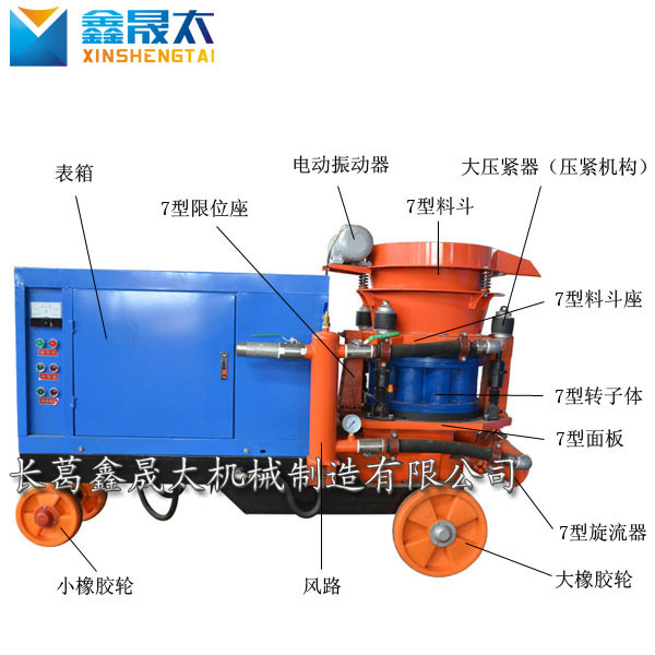 该机主要是由驱动电动机、减速机、转子体总成、密封板、料斗座、振动料斗、压紧机构以及速凝剂输送系统,风路系统和电控装置等部件组成。