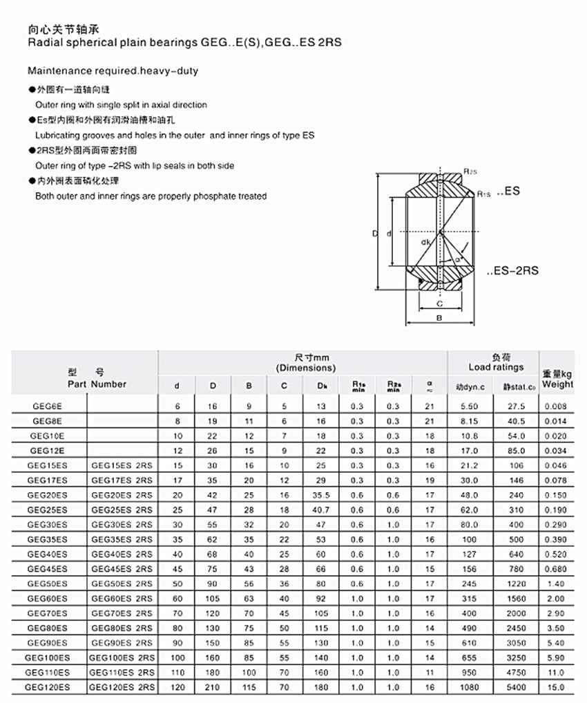 向心关节轴承GEG..E(S)系列,材质为轴承钢,表面磷化处理,淬火处理,硬度在58到62度之间,后缀只有E代表没有油槽,后缀ES代表有油槽,2RS是密封圈,参考尺寸如下:
