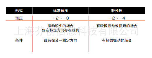 如下表所示,直线滑块有2中预压方式。标准预压为标准直线滑块。这是一种零预压或有微预压的方式。另外一种是轻预压方式,它的预压力比标准预压方式大。它适用于需要高刚性或存在轻微振动的使用场合。我们还可以根据客户需要提供更高预压的直线滑块。