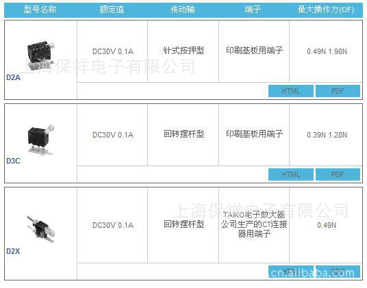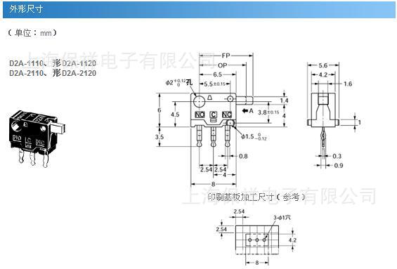 D2A小型检知开关 采用按钮动作式的超小型开关 欧姆龙微动开关D2A型特点如下● 超小型(高6×宽8×深4.2mm)、轻量(约0.3g)、3mm的长行程。● 由于是滑动方式,所以短路、非短路的切换时间可根据使用用途进行选择。 D2A-1110 D2A-2110D2A-1120 D2A-2120