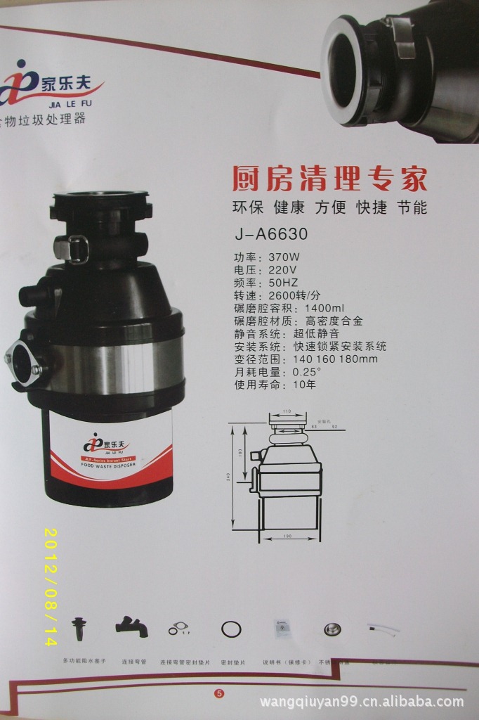 一种新型环保厨房电器,主要用于食物垃圾的粉碎处理,安装于厨房洗菜盆的排水口处,通过小型直流或交流电机驱动二级研磨或三级研磨刀盘,利用离心力将粉碎腔内的食物垃圾进行多次粉碎后排入下水道。产品只可以粉碎残羹剩饭、肉鱼骨刺、蔬菜梗叶、瓜皮果壳、蛋壳、茶叶渣、小块玉米棒芯、禽畜小骨等有机垃圾。