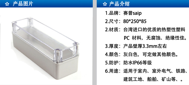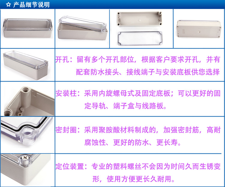 3.材质:选用优质的热塑性塑料ABS、或(PC)聚碳酸酯,或者可以按照客户要求来选择材料,无腐蚀性,绝缘性佳;