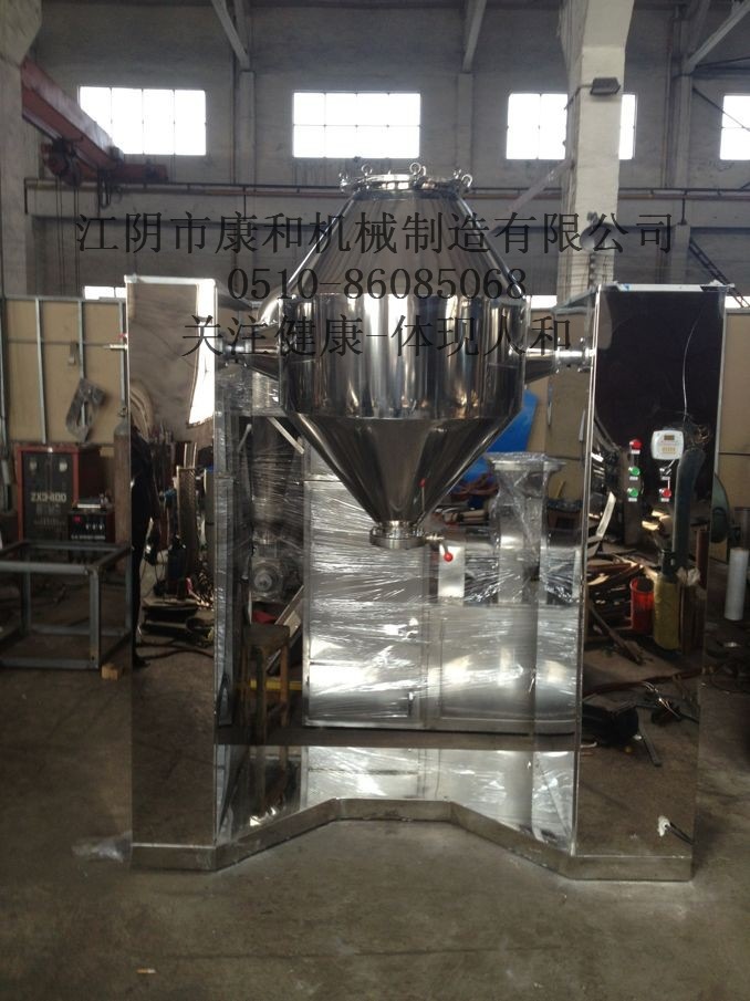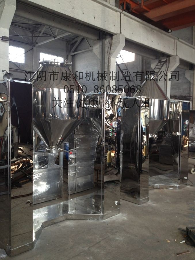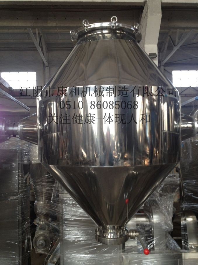 W-系列双锥混合机 搅拌式混合机是我公司在引进日本八洲株式会社的二重回转混合机的基础上,结合我们在粉体混合中的生产经验,加以改进和提高的一种高效混合设备。广泛应用于饲料、食品、农药、染料、颜料、塑料、树脂、化工原料、调味料、化妆品、医学品及各种粉体添加物等的混合,并可应用于添加微量液体的粉体混合。 【 原理及特点 】 适用于比重不同之粉碎或加其它添加物之混和。 采用内外回转搅拌,均匀度高。 混和桶可任意倾斜角度,便于出料及清洁的需要。 设有自动定时装置,可设定0~60分钟自动停止。 采用不锈钢蝶阀放料,无粉尘泄漏和飞扬现象出现。 采用重力扩散原理混合,对物料的压馈小,不会对物料产生剪切粉碎。 筒体采用优质不锈钢制作,内外壁都经抛光处理,混合过程中对物料无污染,功耗小,清洗方便。操作简单,容易清洗,适合G.M.P食品、药厂使用。大容积的混合机可配置真空上料系统,提高工作效率和改善工作环境. 【 技术参数 】 型 号 | W-300 | W-500 | W-1000 | W-1500 | W-2000 | W-2500 | W-3000 | 全容积(m3) | 0.3 | 0.5 | 1 | 1.5 | 2 | 2.5 | 3 | 生产能力 (kg/次) | 60-100 | 100-200 | 200-400 | 300-500 | 400-800 | 500-1000 | 600-1200 | 混合时间(min) | 6-10 | 6-10 | 6-10 | 6-10 | 6-10 | 6-10 | 6-10 | 简体转速(rpm) | 12 | 12 | 12 | 12 | 12 | 12 | 7.8 | 功 率(kw) | 1.5 | 2.2 | 4 | 4 | 7.5 | 7.5 | 7.5 | 外形尺寸 (长×宽×高)(mm) | 1685×800 ×1850 | 1910×800 ×1940 | 2700×1000 ×2370 | 2900× 1000 ×2600 | 3200×1300 ×3200 | 3386×1900 ×3560 | 4450×2200 ×3600 |