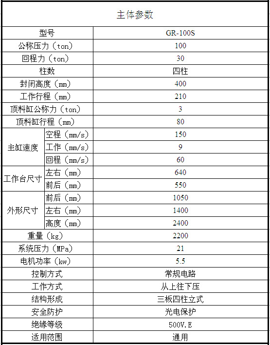 本机器主要由四柱(框架)机身、液压系统、电气系统、操作面板及仪表、主缸等组成。