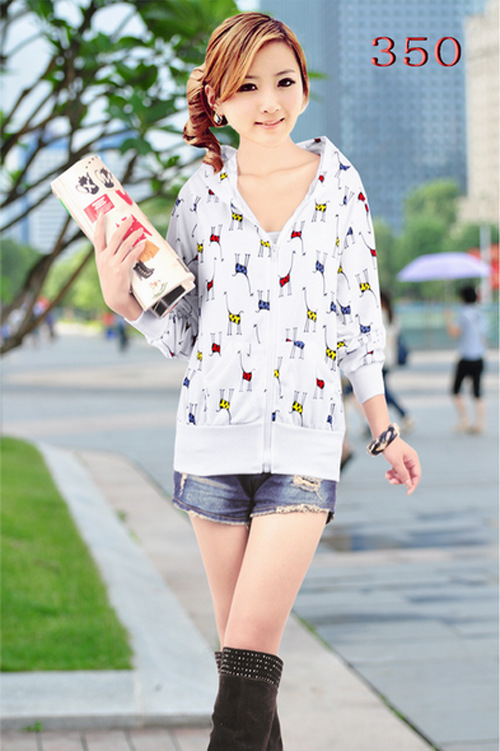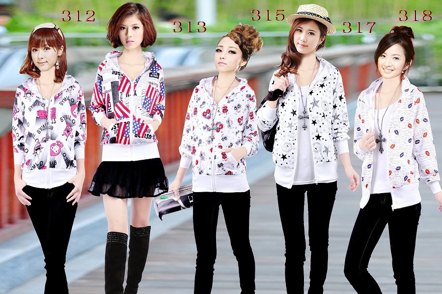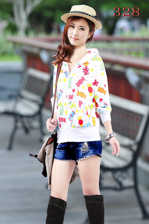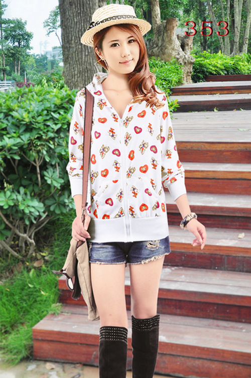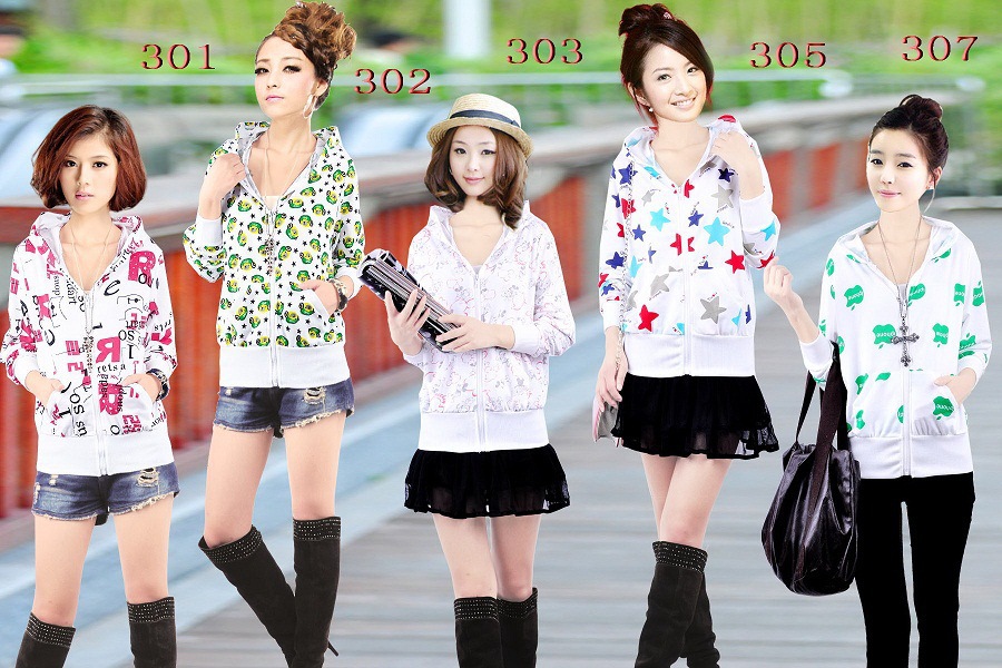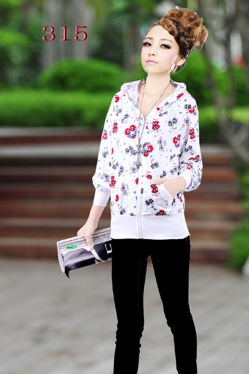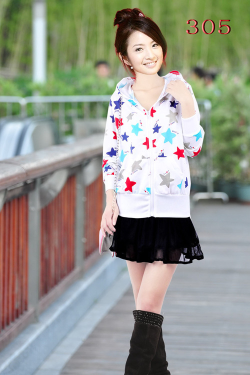 尺寸:衣长60CM;袖长58CM;肩款40CM;胸围100CM工艺:全面时尚印花,带拉链,连帽,衣袖口及口袋处均有螺纹设计。