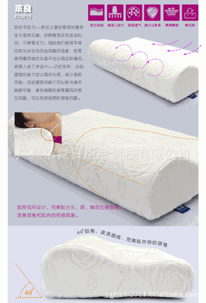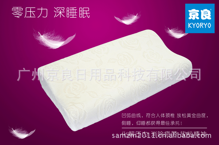 京良慢回弹零压力记忆枕使用100%进口聚氨酯一次发泡模塑成型。