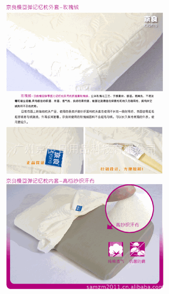 三、表面布套:京良慢回弹零压力记忆枕采用优质超柔玫瑰绒,舒适时尚,玫瑰绒的特点:立体玫瑰花工艺、手感柔软、舒适,易清洗,不易发霉和滋生细菌,具有极佳的吸湿、排湿、透气性、良好的柔软度、能够达到最佳的保暖性和持久的耐用性,拥有其它绒类所不及的优势。而目前市面上很多采用某些提花针织布料,使用半年多就开始起毛、起球,容易勾线。