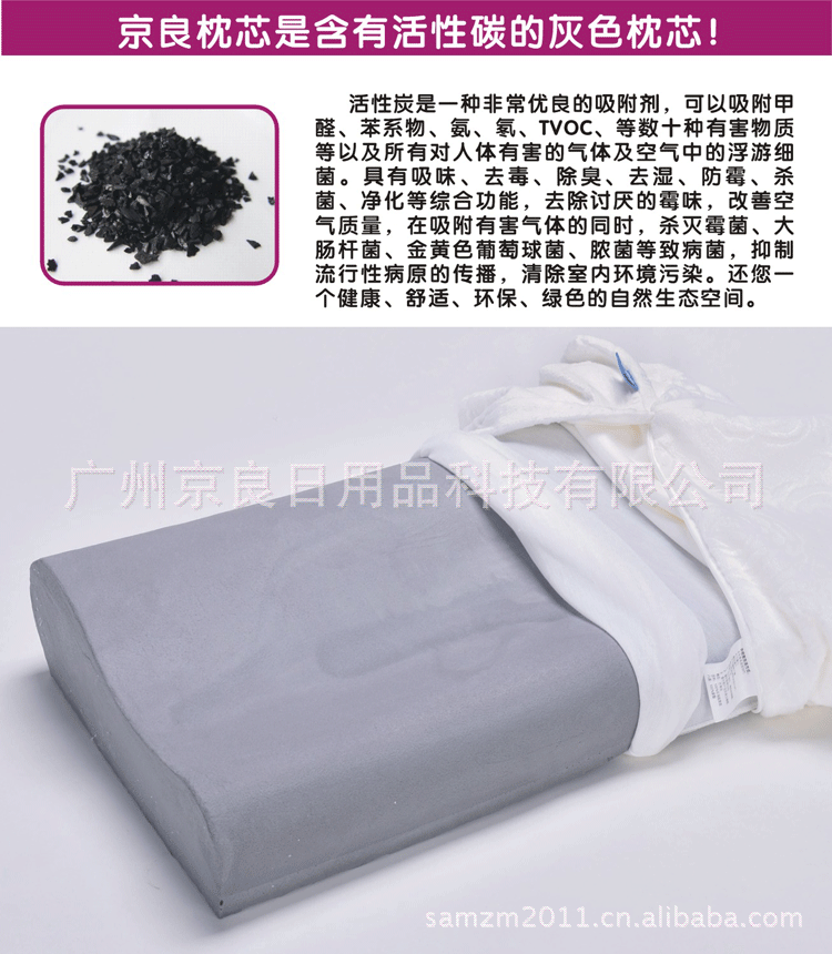 二、使用材料:京良慢回弹零压力记忆枕使用100%进口聚氨酯,通过了SGS的国际标准毒害检测,而且京良慢回弹零压力记忆枕在枕芯材料中添加了活性炭素材,活性炭是一种非常优良的吸附剂,可以吸附甲醛、苯系物、氨、氡、TVOC、等数十种有害物质等以及所有对人体有害的气体及空气中的浮游细菌。具有吸味、去毒、除臭、去湿、防霉、杀菌、净化等综合功能,去除讨厌的霉味,改善空气质量,在吸附有害气体的同时,杀灭霉菌、大肠杆菌、金黄色葡萄球菌、脓菌等致病菌,抑制流行性病原的传播,彻底清除室内环境污染。还您一个健康、舒适、环保、绿色的自然生态空间。