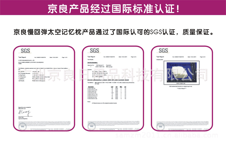 京良慢回弹零压力记忆枕使用100%进口聚氨酯,通过了SGS的国际标准无毒害检测,婴幼儿及老人都可以放心使用。