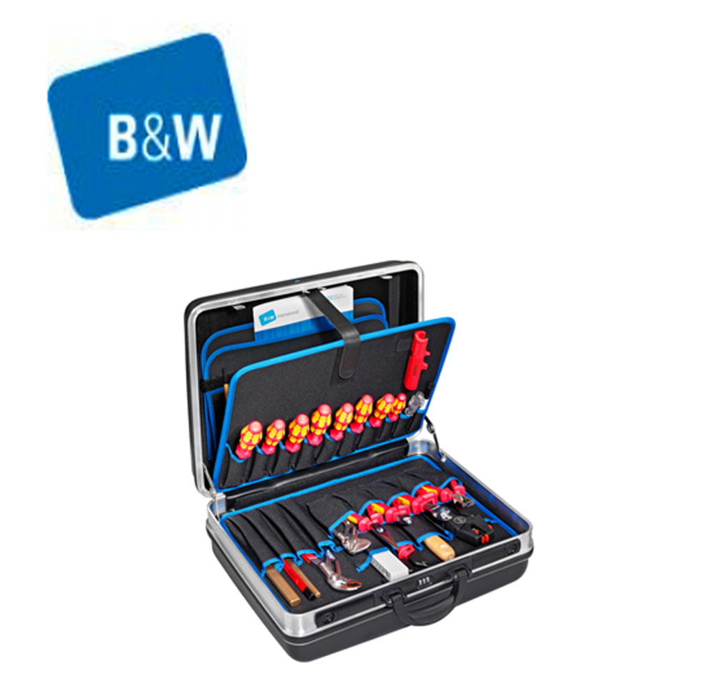 1.箱面是不会产生凹痕的ABS材料2.坚固的铝框3.两把边锁和一把B&W proficode的密码锁4.B&W convenience手把5.舒适的支撑杆和铰链6.上盖文件袋(A4格式)7.可变的下箱格局8.工具片有三种不同的结构9.上箱内有可拆装的工具片,正反面都有3个可以放工具的摸角,可放最大工具是Φ18mm10.下箱内有可拆装的盖板,带有3个放工具的摸角,可放最大工具是Φ21mm