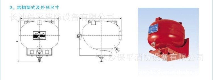 由储存罐、喷头、压力信号器、压力表组成,可悬挂于可以承力的地方或安装于墙壁上,与火灾报警系统、气体灭火控制器构成一套自动灭火装置。