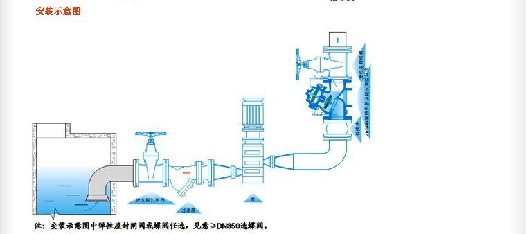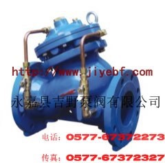 【JD745X(760)(DY300X)多功能水泵控制阀产品概述】:多功能水泵控制阀分隔膜式、活塞式两大类,采用双室驱动装置,Y型结构。每类产品中都由一个主阀及导阀、配管、管件等组件组成。根据使用目的、功能及场所的不同,只需通过改变导阀及配件的安装管路,形成一个完整的控制系统,就可以得到性能要求不同的各种阀门。多功能水泵控制阀能够调控开启、关闭速度,在系统运行中能起到逆止、消水锤、保护水泵、电机、管路的作用。 【JD745X(760)(DY300X)多功能水泵控制阀设计选用要点】:( 1 )工程式中应用的水力控制阀是经过制造厂检验合格,各种标识齐全,技术资料符合要求的产品。( 2 )根据功能要求,选择阀门种类,再根据管道输送介质、温度、建筑标准和业主 要要求 等,确定阀门的阀体和密封部位的材质。常用的阀体材料有铸铁 、铜铁、铜、塑料等。常用的密封面和衬里材料有铜合金、塑料、钢、硬质合金、橡胶等。阀 体材料应与管道材料相匹配。( 3 )阀门的公称压力有0.6、1.0、1.6、2.5和4.0MPa等不同级别,管道输送的介质,其工作压力应小于阀门的公称压力值。( 4 )工程中水力控制阀的设置应当有足够的空间,以便管理、操作、安装和维修,并应符合管路对阀门的要求。( 5 )管路采用法兰连接时,应采用法兰连接的水力控制阀;管路采用沟槽式连接时,应采用沟槽式连接的水力控制阀。( 6 )水利控制阀应设置在介质单向流动的管路上。( 7 )水利控制阀主阀体上的箭头方向必须与管路系统流向一致。( 8 )接水力控制阀管段不 应有气堵 、气阻现象。在管网最高位置 等存气段 应设置自动排气阀。( 9 )阀门水平安装时,阀盖、阀杆应朝上。垂直安装时,阀盖、阀杆应朝外。( 10)阀门安装前应做强度和严密性试验。( 11)阀门的强度和严密性试验应符合以下规定。 A、阀门的强度试验压力为公称压力的1.5倍; B、阀门的严密性试验压力为公称压力的1.5倍; C、试验压力在试验持续时间内应保持不变,且壳体填料及阀瓣密封面无渗漏。