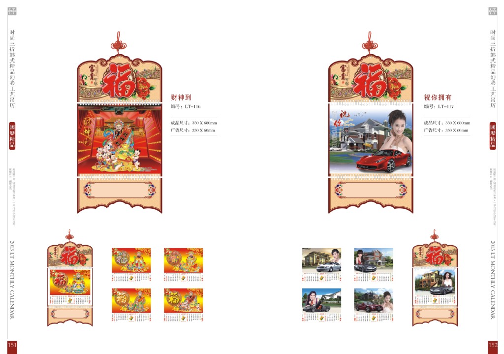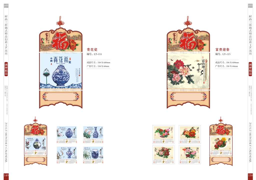 此款是时尚三折韩式精品幻彩工艺吊历。挂历尺寸:350*680mm广告尺寸:260*60mm。建议同等质量比价格,相信可以选择自己更实惠,送礼更大方的高档吊历