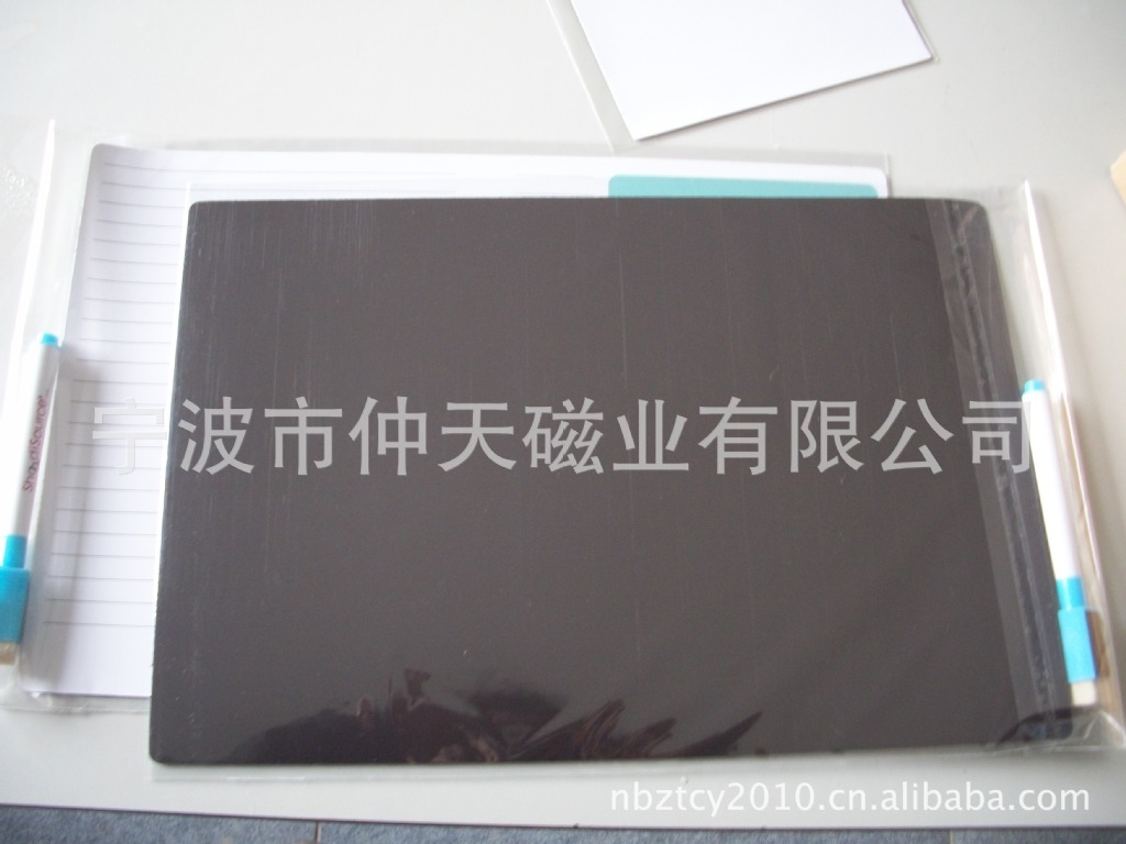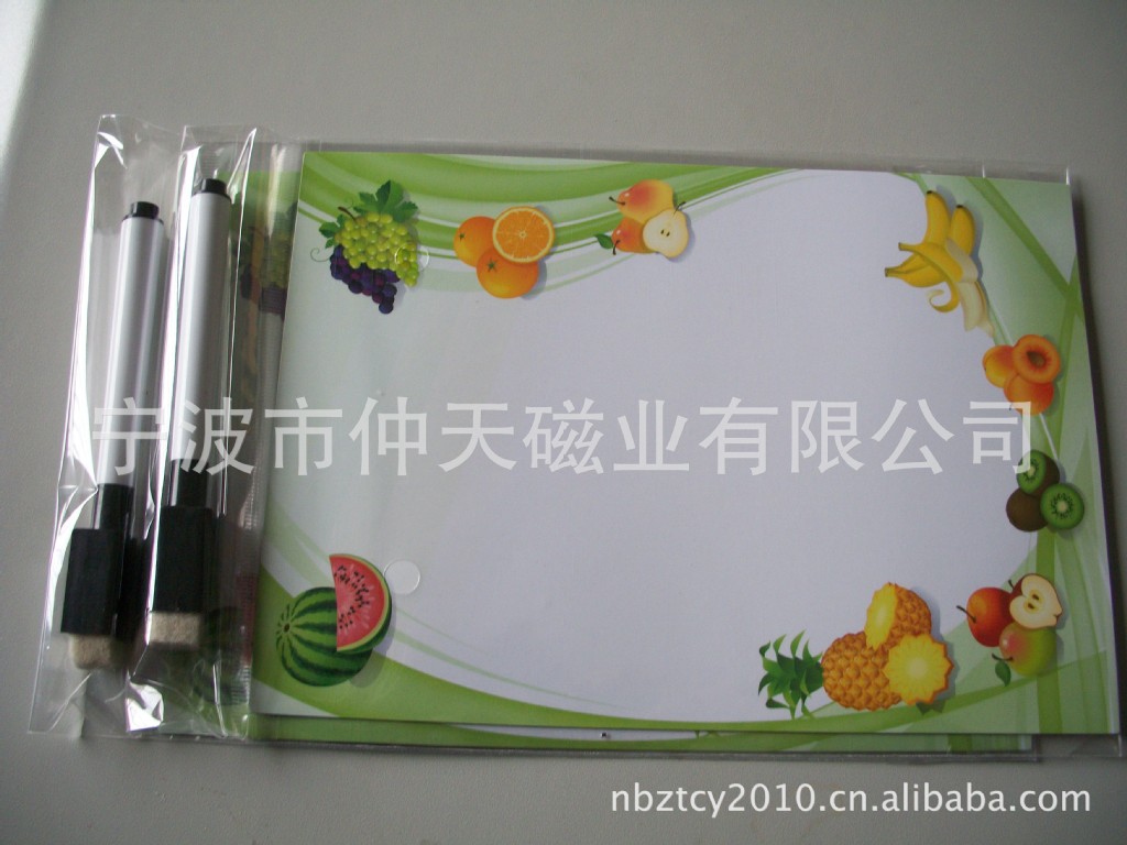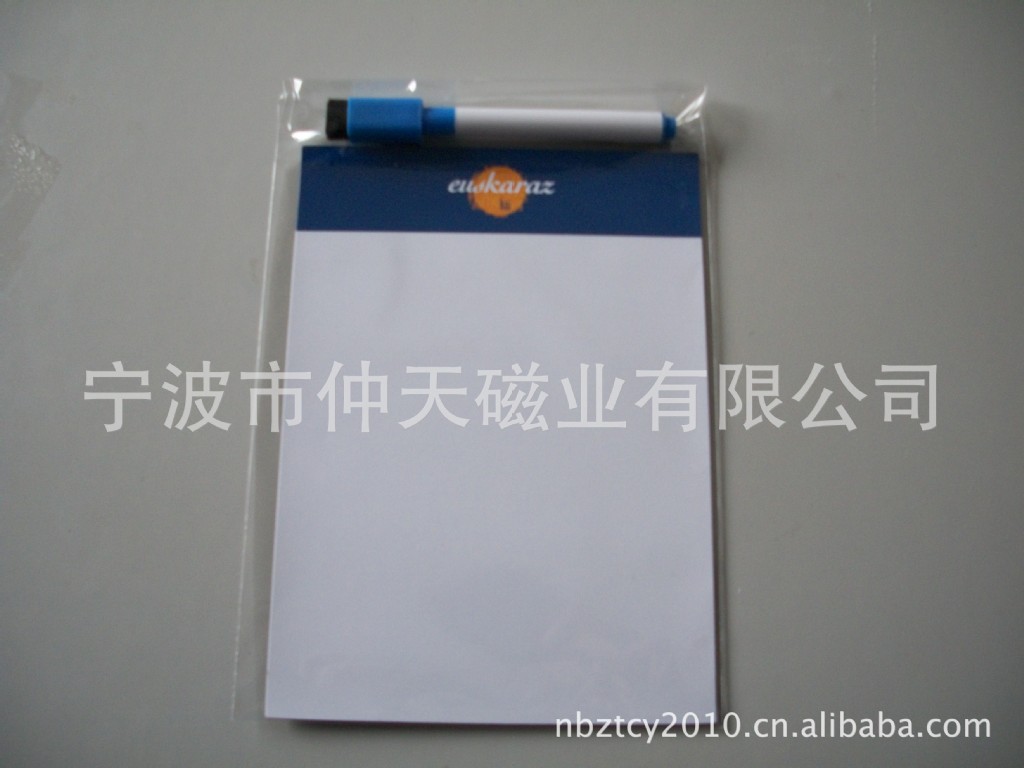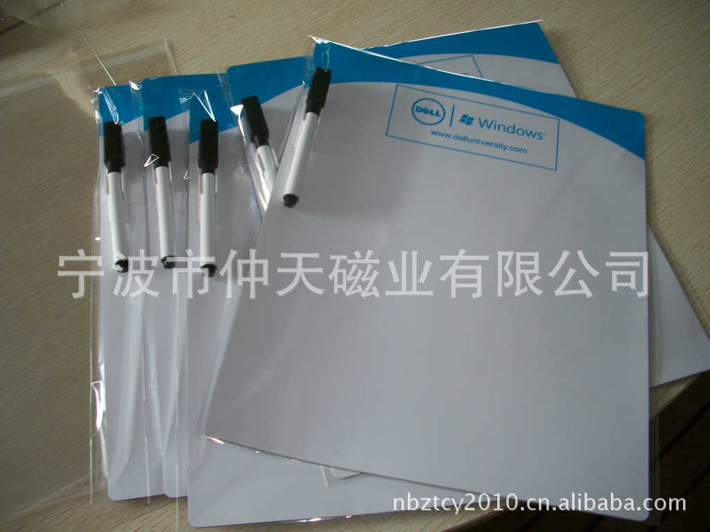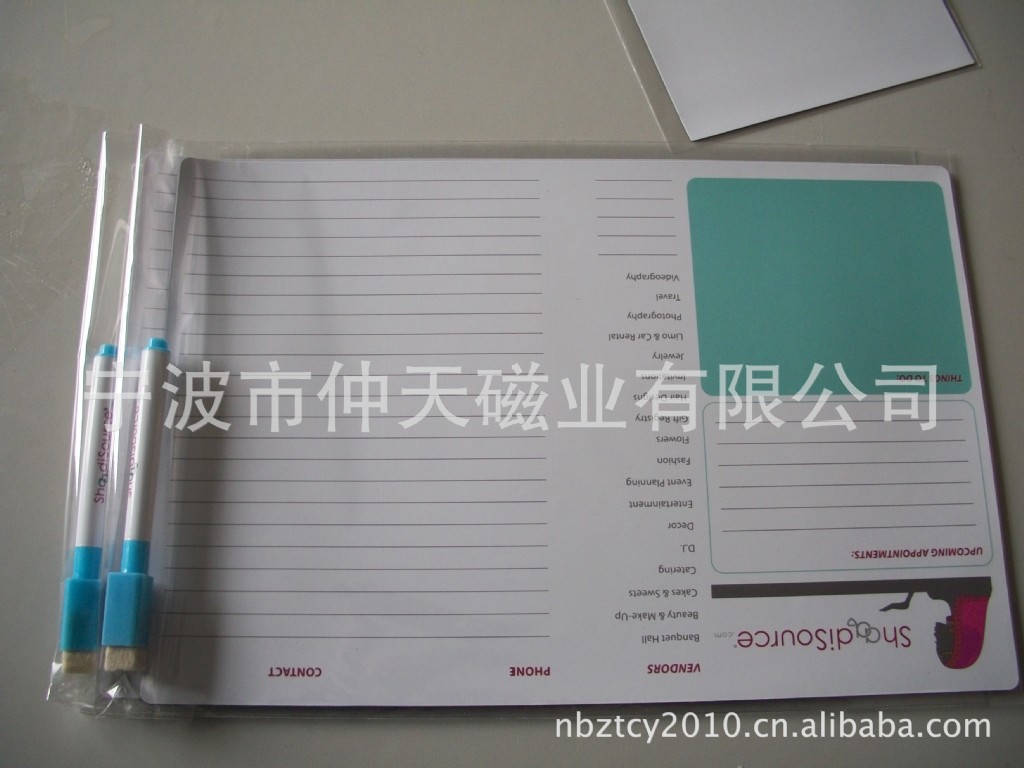4)磁性留言板白板:采用软胶磁铁(或纸板)+铜版纸四色印刷裱光膜+可擦笔.