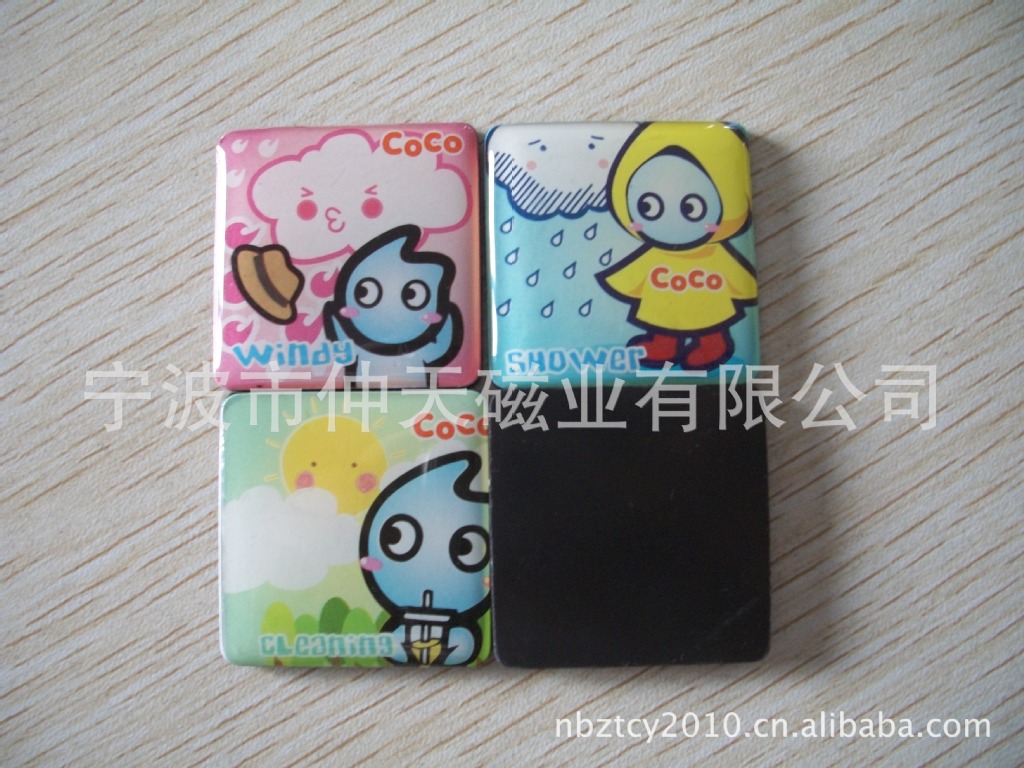 3)磁性冰箱贴:采用下面软胶磁铁+上面铜版纸或PVC彩色印刷腹膜制作而成。
