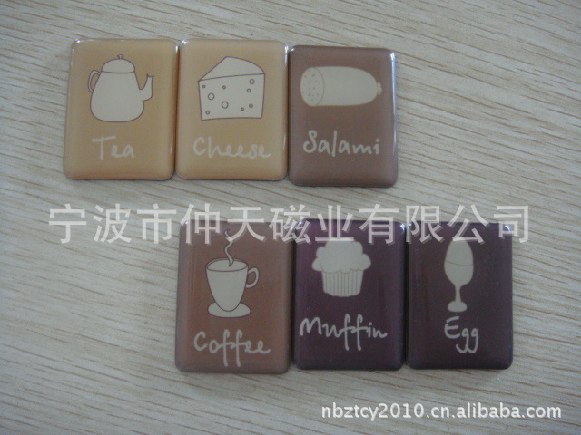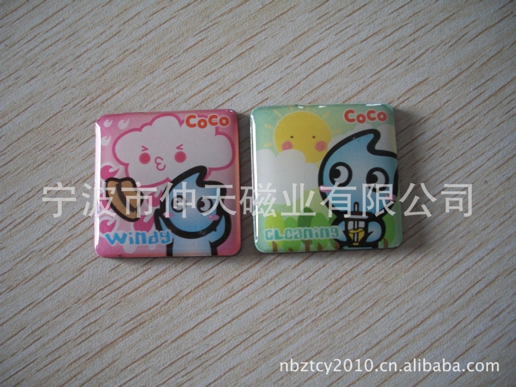 10)滴胶冰箱贴:采用下面软胶磁铁+上面铜版纸彩色印刷+滴胶腹膜制作而成