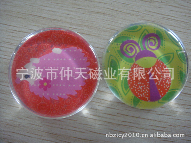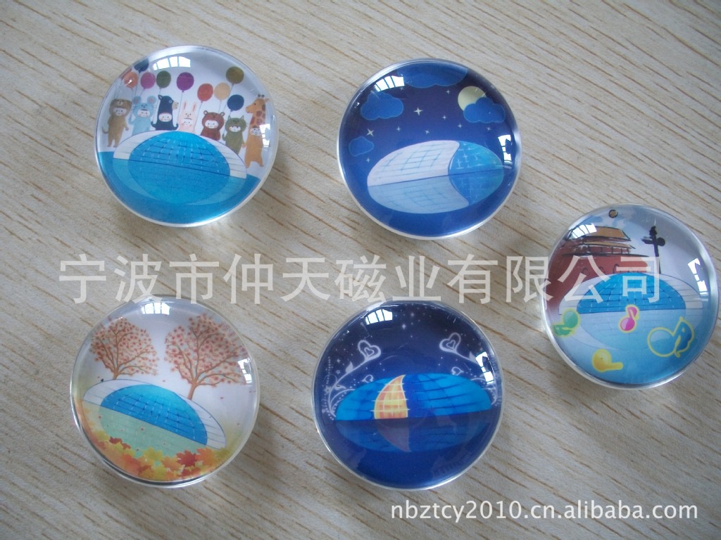 9)玻璃冰箱贴:采用下面软胶磁铁+上面铜版纸彩色印刷+半圆玻璃窗腹膜制作而成