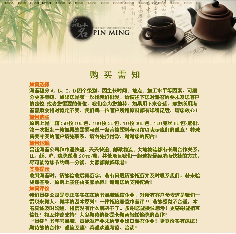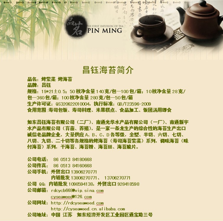 品名:烤紫菜、烤海苔品牌:昌钰规格:50枚/袋(净含量140克)—100袋/箱生产许可证号:QS320622010004执行标准:GB/T23596-2009保质期:365天适用范围: 紫菜包饭、寿司料理、米果糕点、食品加工、汤用饭团即食公司电话:86 0513 84180668;公司传真: 86 0513 84160668 公司手机:外贸出口13906270771;内销批发13806270771、13706270771