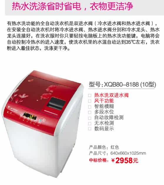 型号名称产品品牌: 友田 所属系列: 4 基本参数脱水噪声: 70.00 dB(A) 洗净比: 0.80 额定耗电量: 0.02 kWh/cycle/kg 额定耗水量: 22.50 L/cycle/kg 甩干脱水速度: 800.00 rpm 脱水容量: 8.00 kg 洗涤容量: 8.00 kg 自动化类型: 电脑全自动 能效等级: 2级 滚筒开门方式: 非滚筒洗衣机 产品类型: 波轮式 外观参数产品重量: 36.50 kg 尺寸-高: 1015.00 cm 尺寸-宽: 640.00 尺寸-长: 630.00 cm 外观颜色: 红 银 功能参数洗衣程序及功能特点说明: 详见说明书 显示屏类型: LED显示 包装清单请注明包装清单: 详见说明书 费用包含其他额外费用请说明: 由当地零售商自定 是否需要配件费: 是 是否需要安装费: 是 是否需要送货费: 是