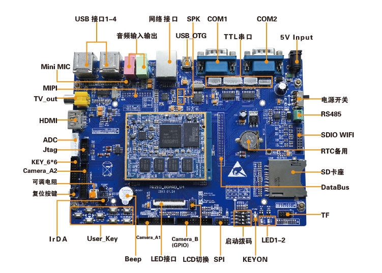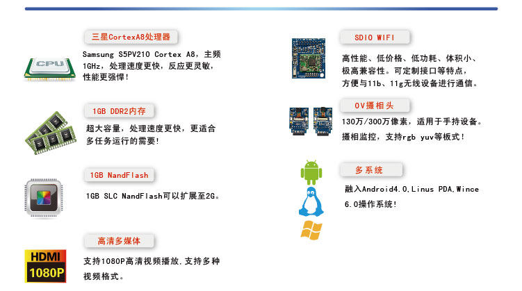 TQ210开发板目前提供Linux PDA系统(2.6.35.7)、Android 4.0系统。板上硬件配置为3个1G:1G主频、1G DDR2、1G SLC Flash(性能相对于MLC更可靠,读写次数高达10万次),为TQ210芯片强大的应用功能,非常适合对于原ARM所开发产品的升级,紧密联系市场需求和变化。