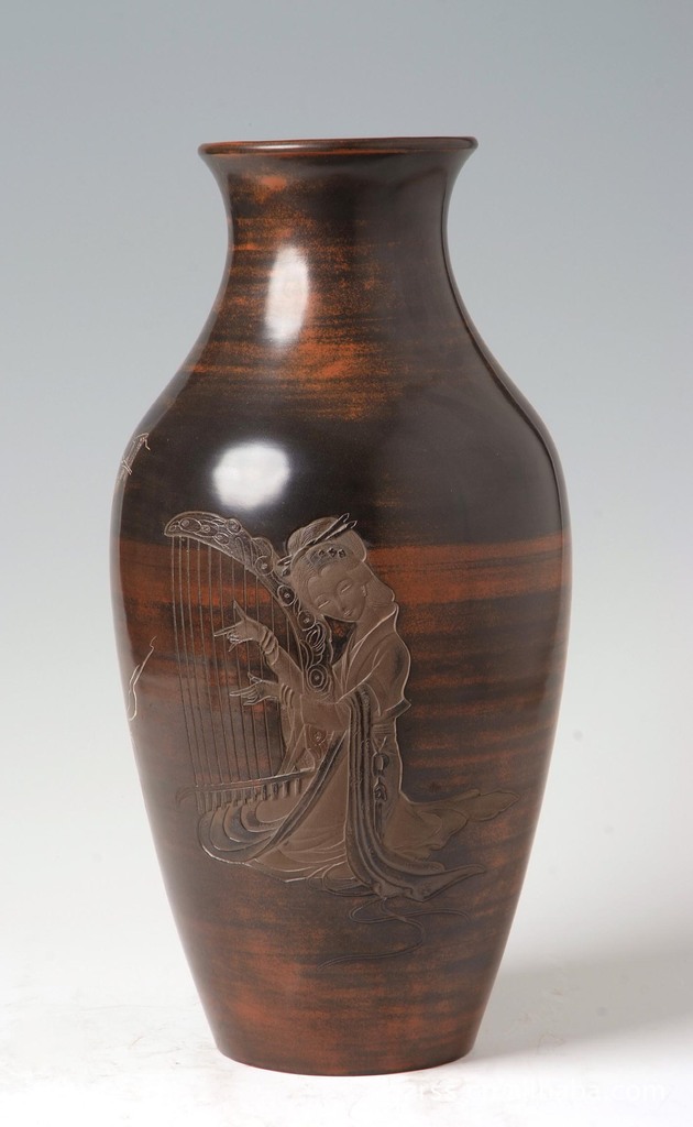 坭兴陶产品经窑变,表层还保留着朱色或紫红的原色。经打磨去表后才发现其真面目,形成各种斑斓绚丽的自然色彩,若隐若现古铜、墨绿、紫红、虎纹、天蓝、天斑、金黄、栗色、铁青等诸多色泽,质地细腻光润,具有很高的欣赏和收藏价值。