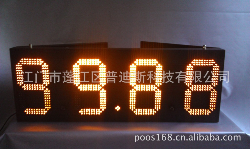 2. 数字颜色单色显示,不同颜色显示亮度不同:红色(4000MCD)绿色,蓝色(8000MCD)黄色(3500MCD)白色(12000MCD).LED油价屏亮度控制:自动控制(通过光敏探头自动控制,白天亮度高,晚上亮度低达到节能要求和环保。单个数字可以分段拆装, 数字8由7个笔段组成,数字模组防水设计,防水等级:IP65.可视距离:150-1000米