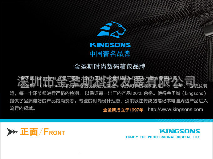 金圣斯国际集团成立于1997年,总部设在广州市花都区,旗下拥有深圳电子厂、上海分公司。现有员工1000多人,厂房面积35000多平方米。经过金圣斯人十多年来的努力,与世界众多知名企业建立了长期合作伙伴的关系,业务遍及105个国家和地区,拥有一批技术过硬的专业人才,现有科技创新专利成果20多项,并多次获得由政府部门颁发的“中国著名品牌”、“守合同重信用企业”、“广州市民营科技企业”、“广州市用户满意产品”等荣誉,是全球笔记本电脑外设产品技术领军企业之一。作为行业的坐标,本集团在成为“北京2008奥运会合作商”、“广州2010亚运会电脑包供应商”的同时,又加大力度发展电子商务,勇夺“全球十大网商”称号,并于2010年8月拔得阿里巴巴《天下网商》坐标中国001号头筹。 集团集研发、设计、生产及品牌营销为一体,全面贯彻实行ISO9001:2008国际质量体系标准,从原材料的购买到进厂、生产、包装及装运,每一个环节都进行严格的检测,以保证每一出厂的产品100%合格。通过全方位的市场调研,充分了解用户的需求,从而制造出让顾客满意的产品。专业时尚的设计理念,引航以往传统的笔记本电脑周边用品进入流行的领域。在2006年成立的香港金圣斯国际集团有限公司,展开了”金圣斯Kingsons”全球品牌运作的序幕。 经过集团全体员工十多年来的努力开拓,已经成功的为联想Lenovo、海尔 Haier、七喜HEDY、三星SAMSUNG、华为Huawei、夏新amoi、中国政府科技部、马来西亚政府教育部、阿里巴巴Alibaba等公司提供产品服务,并赢得客户一致好评!