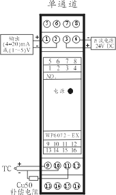 注:订货时必须注明量程范围 (范围内可任意选择)。 安全区输出: WP6072-EX WP6072-EX(V) 信 号: (4~20)mA (1~5)V 负载电阻: ≤500Ω ≥250kΩ 输出精度:0.5级 补偿精度:1/20℃(补偿电阻:Cu50铜电阻) 温度漂移: 0.01% F.S/℃ 连续工作温度: 0~+50℃ 国家防爆电气产品质量监督检验中心 (CQST)认证参数 (9、10端子间) U 0:4V, I0:90mA, C0:100μF ,L0:4.2mH,P0:0.09W, Um:250VAC/DC 适用现场设备 :J、K、T、E、S、B、R热电偶传感器。